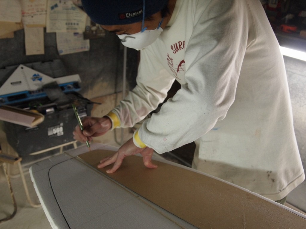 シェープの際は”プレーナー”と言われる機器を使用していよいよ削り出していきます!”乗り手の体つきや体重、身長、どこでサーフィンするか、どんな波に対応する必要があるのかなどを総合的に考えます”