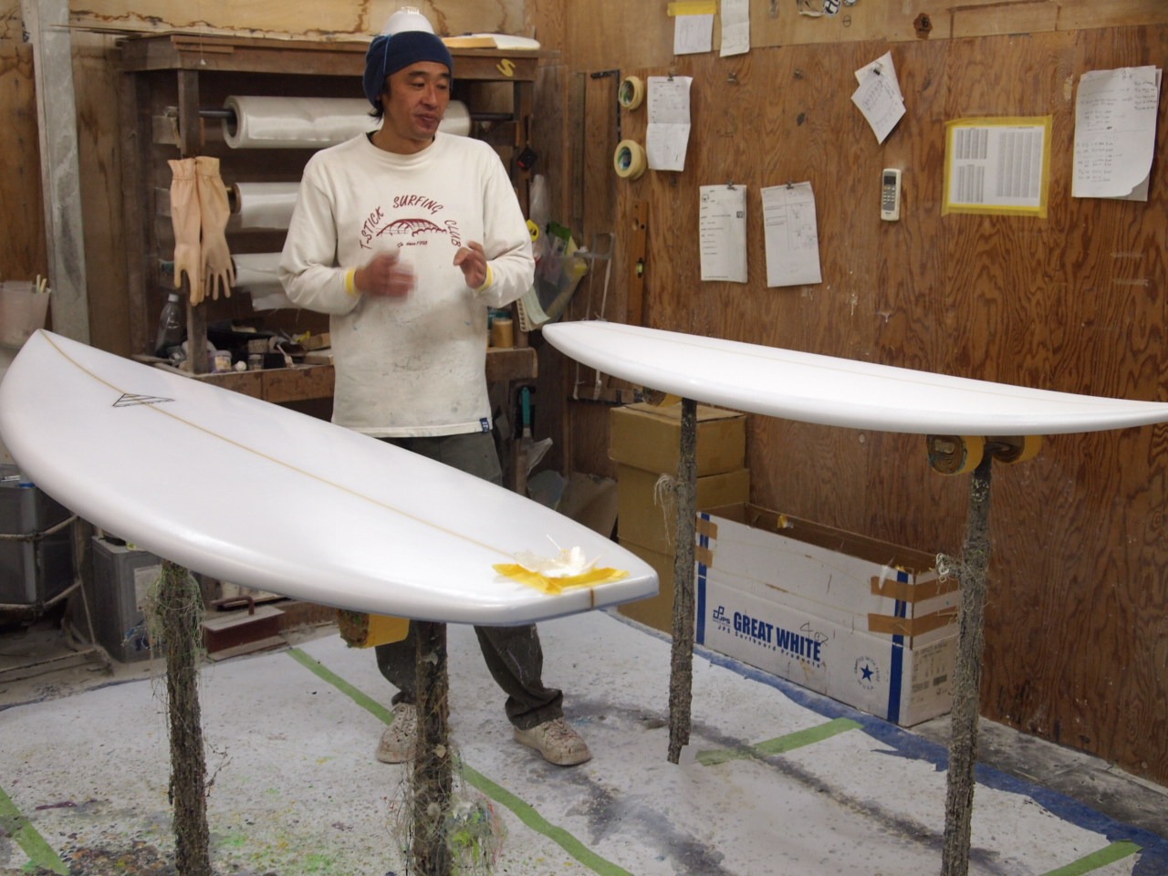 ”サンディング” :サーフボード表面の余分な樹脂を削り落とす作業となり、これが最後の工程となります。