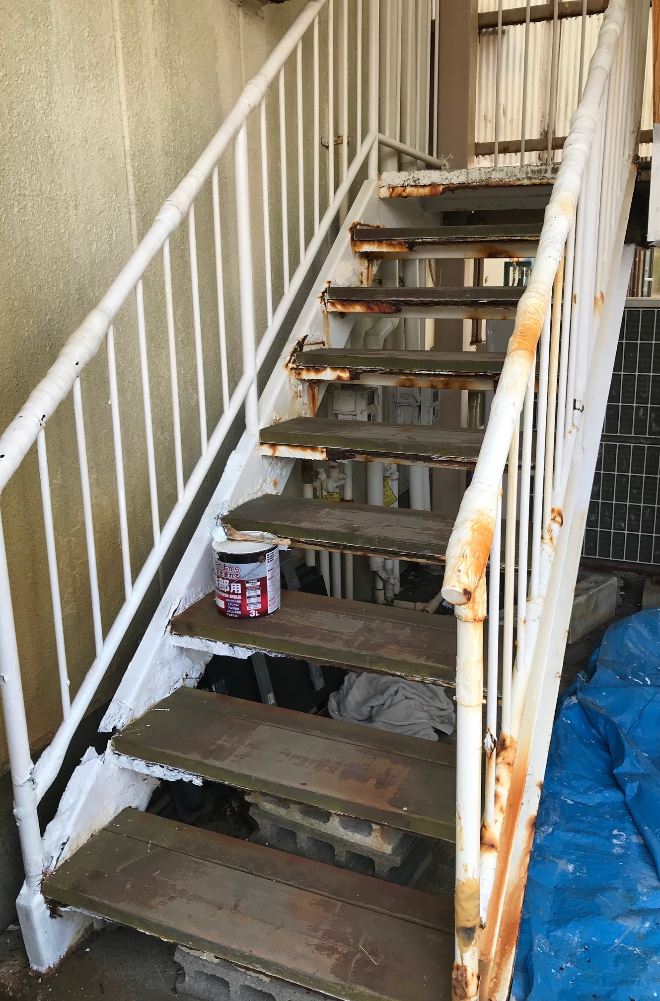 さて、今日は当店の店の裏手にある塩害によって錆びまくっている階段を毎年好例のペンキで塗装しちゃいました!